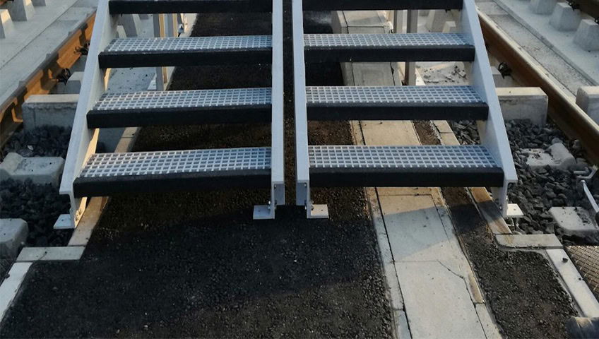 Traptreden, zijn bij Lichtgitter eveneens verkrijgbaar in kunststof en bestaan uit een gegoten GRP-rooster met een zwart gekorreld aantredeprofiel als antislipneus. Meestal hanteren we hier een 38 mm hoog GRP-rooster als basis. Op verzoek kunnen de ondersteuningshoeken 75x75x8 mm met zijdelingse gaten als zijplaten worden geleverd. Deze worden door middel van het juiste bevestigingsmateriaal met de trapleuning verbonden.